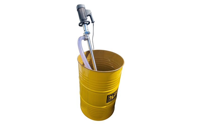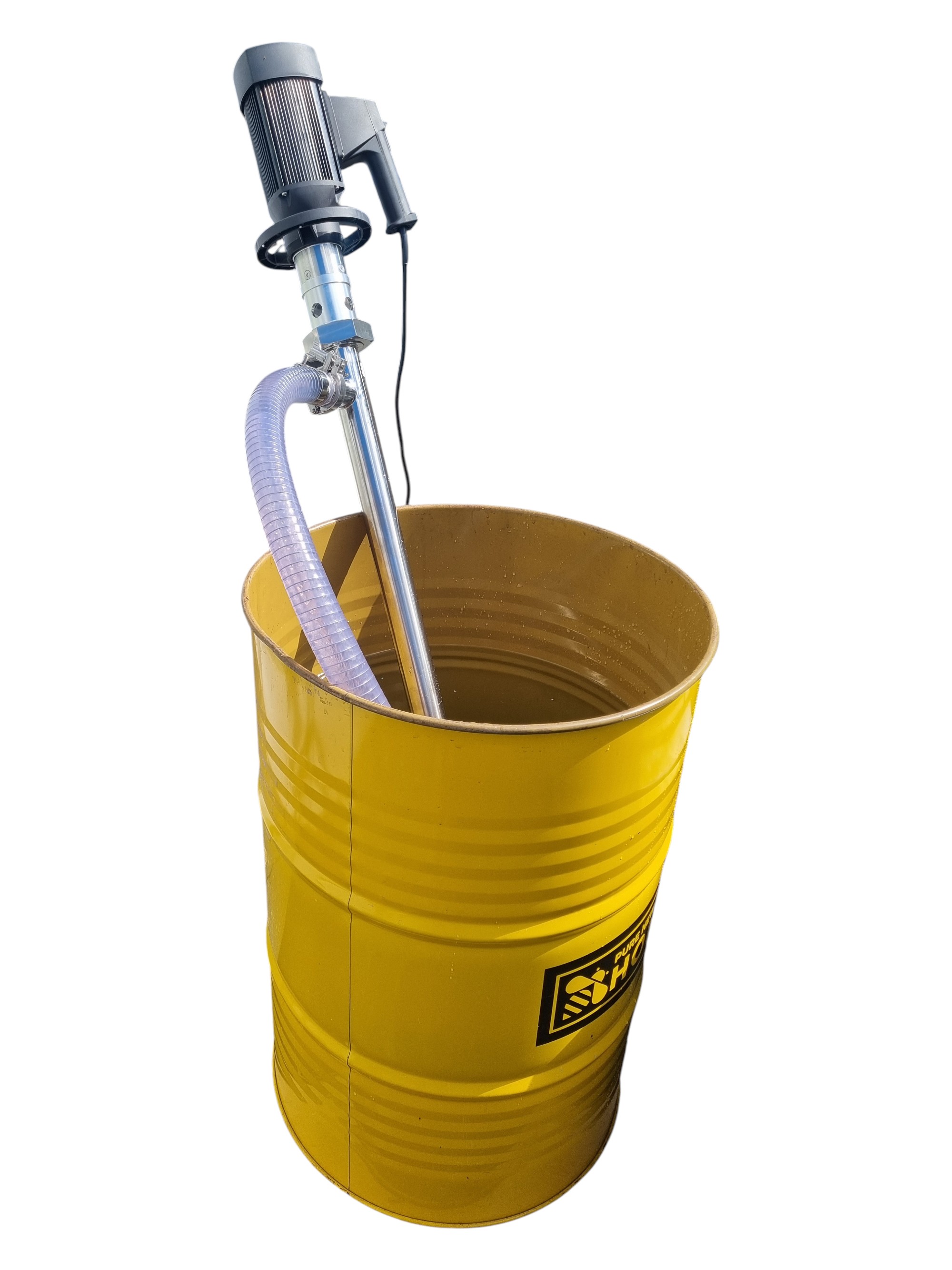The electric progressive cavity drum pump is designed for viscous, shear-sensitive products that require gentle, pulse-free transfer. A long rotor and stator assembly runs down into the open drum, delivering positive-displacement pumping even on cold or partially crystalised liquids.