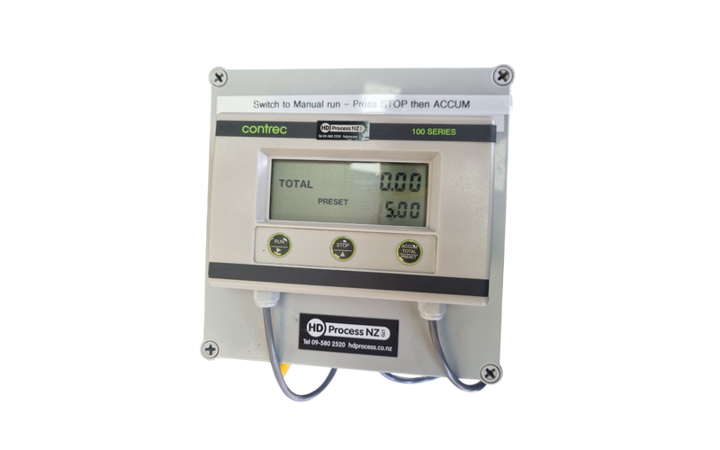 HD Process supply customized flow controller systems including small standalone systems like the Contrec batch controller with solenoid valve for dosing control in this photo.