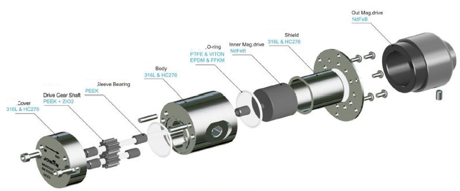All stainless steel gears are available in pumps 1.5 " and larger. For smaller pumps gears are produced in PEEK in shafts and generally in stainless steel or ceramic. Motors can be provided as standard 240/ 400 VAC or as servo motors.