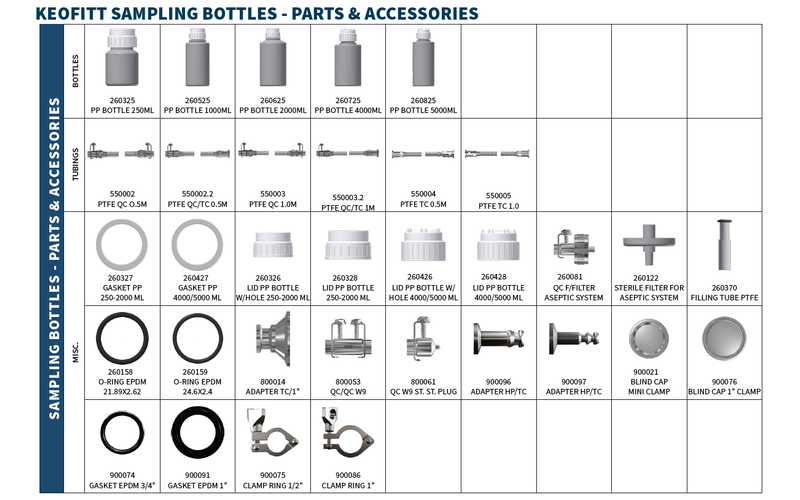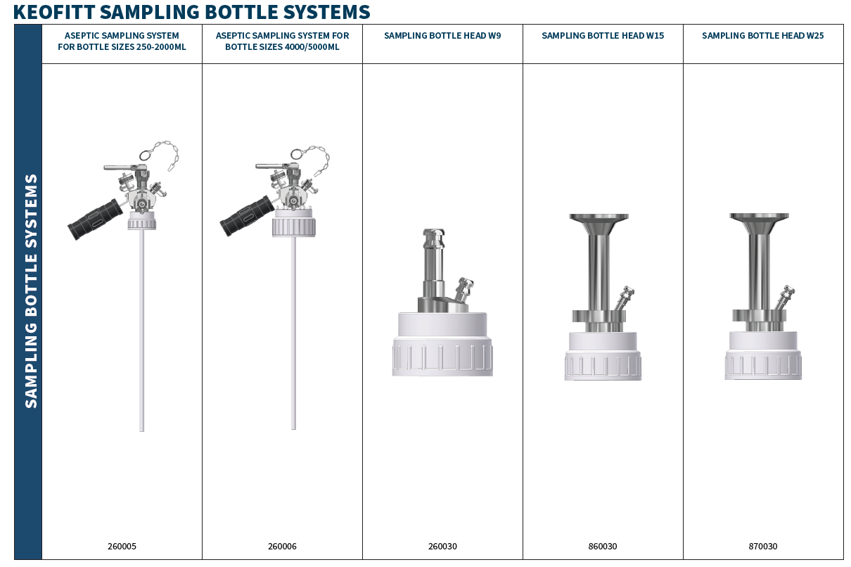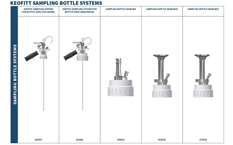Compatible with all Keofitt sampling systems Whether used with W9, M4, Sesame, W15, W25, or other Keofitt valves, the bottles provide a reliable, leak‑free fit.