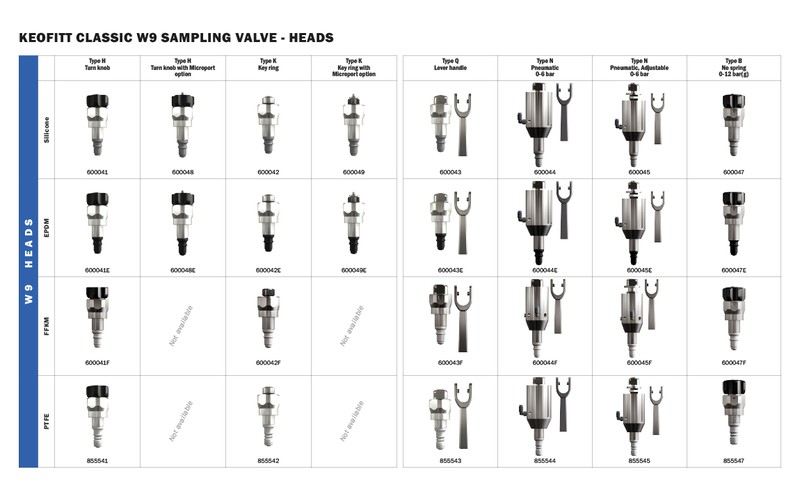The W9 is suited for products up to roughly 1,000 cP and for applications requiring repeatable, contamination‑free sampling. Identifiable by the 9mm port that it samples through and the code located below the Keofitt logo on the body.