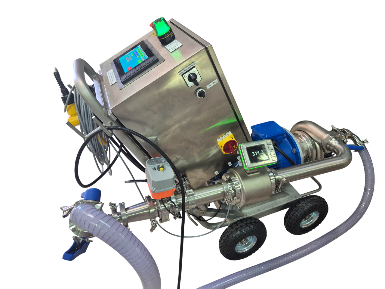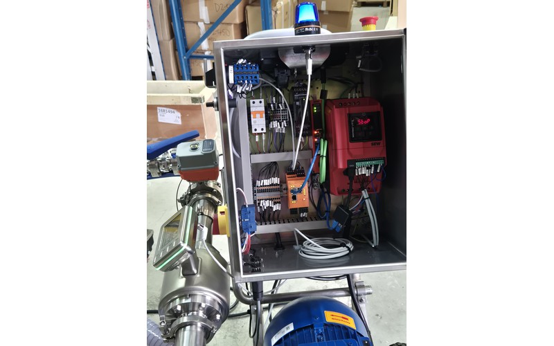 For this type of large centrifugal pump a high accuracy hygienic (IFM) flowmeter has been selected, and the pump is controlled with the assistance of an automatic electrically controlled butterfly valve.