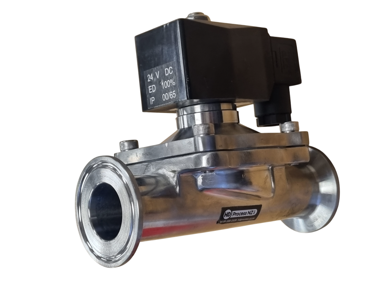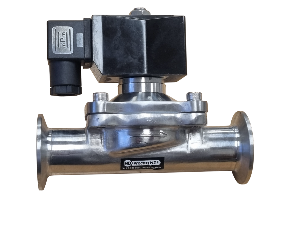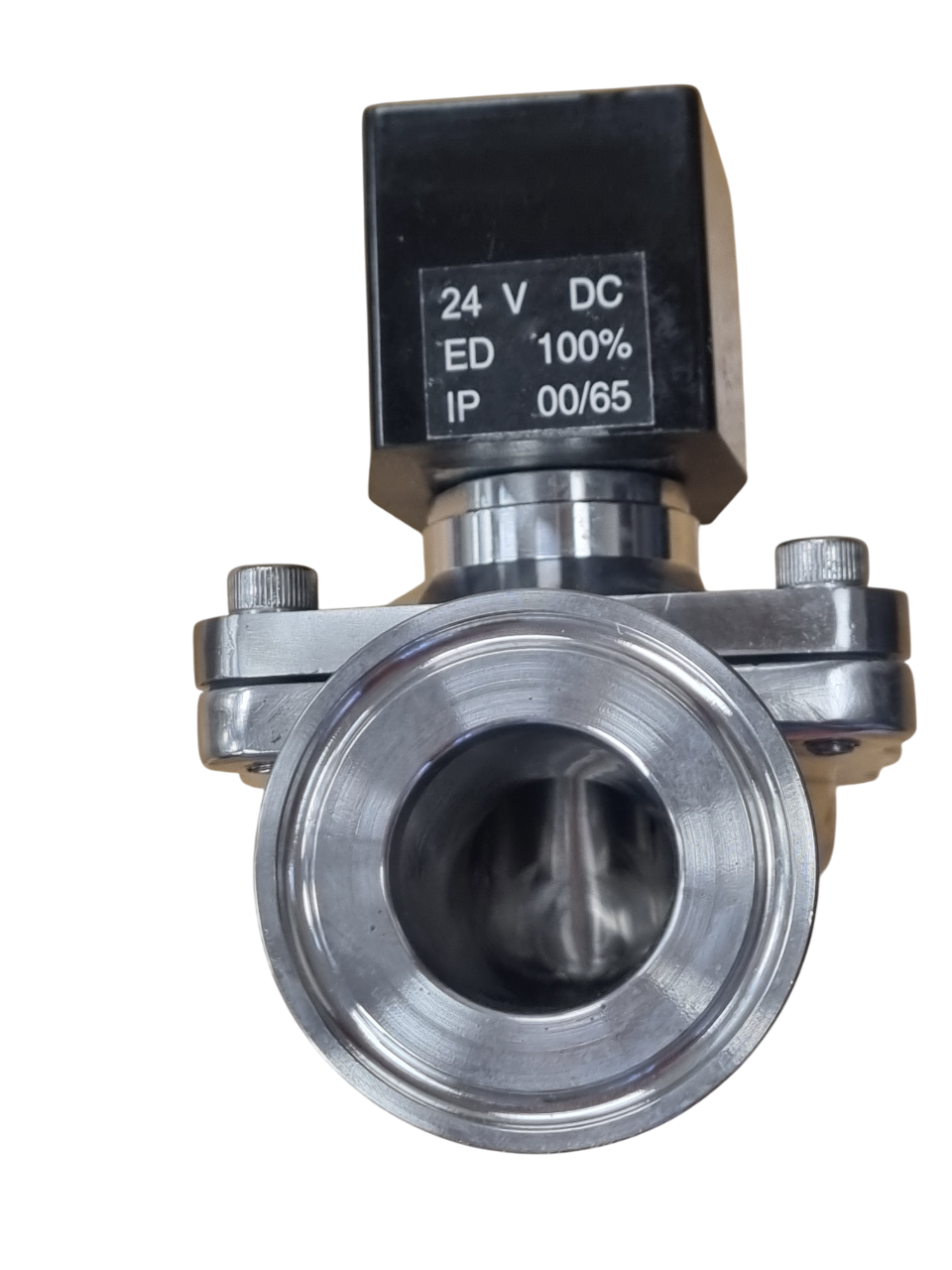 HD Process supply various solenoid valves including stainless steel bodied unit with tri-clover connections in the photo on this URL. Photograph of internal mechanism on this URL.