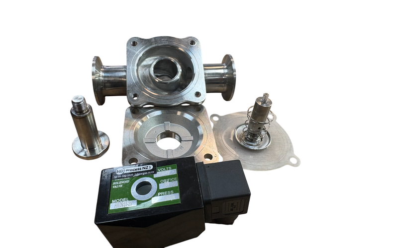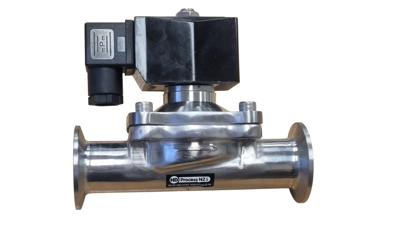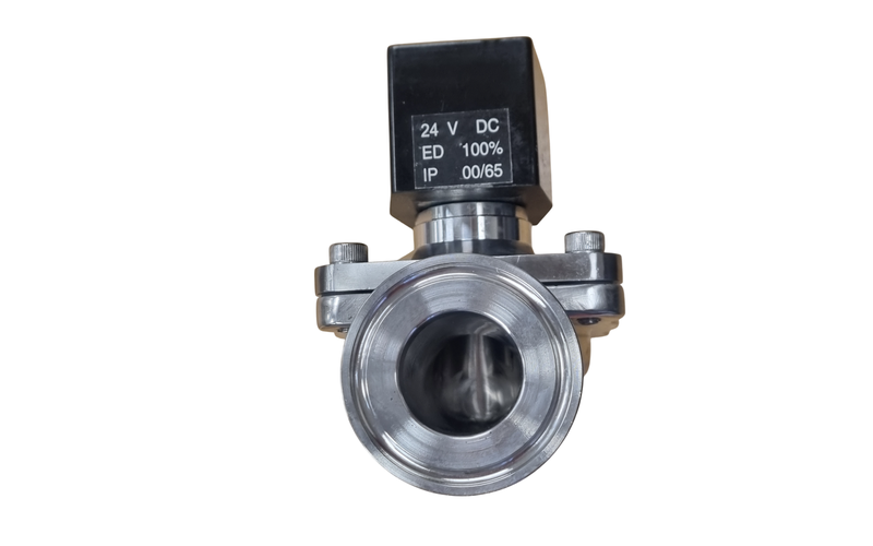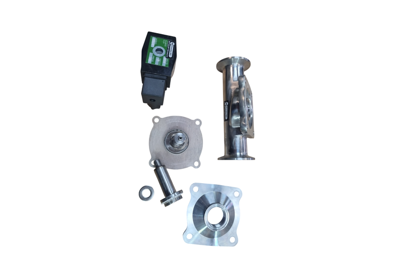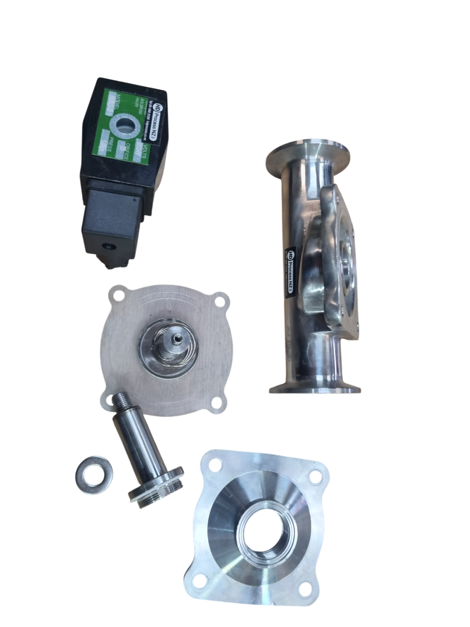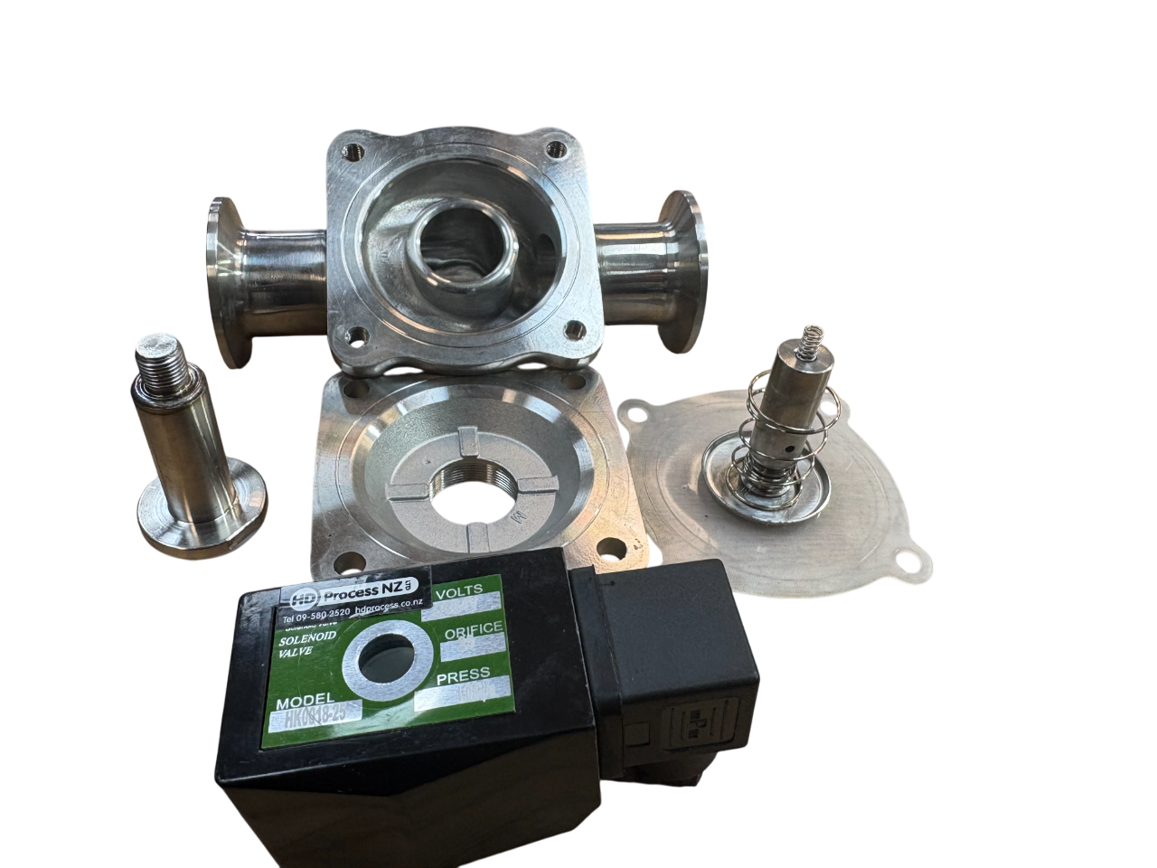 HD Process supply various solenoid valves including stainless steel bodied unit with tri-clover connections in the photo on this URL. Photograph of internal mechanism on this URL.
